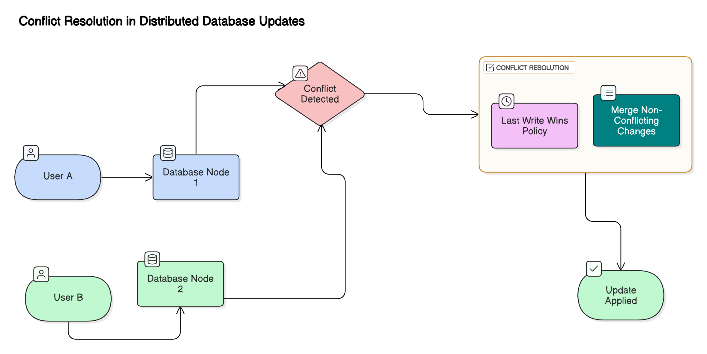 - Example: In a distributed database, two users might update the same record simultaneously on different nodes. To resolve this conflict, the system could use a “last write wins” policy (LWW), where the most recent update (based on a timestamp) is accepted. Alternatively, it could merge the changes if they are not conflicting (e.g., combining lists of items).
