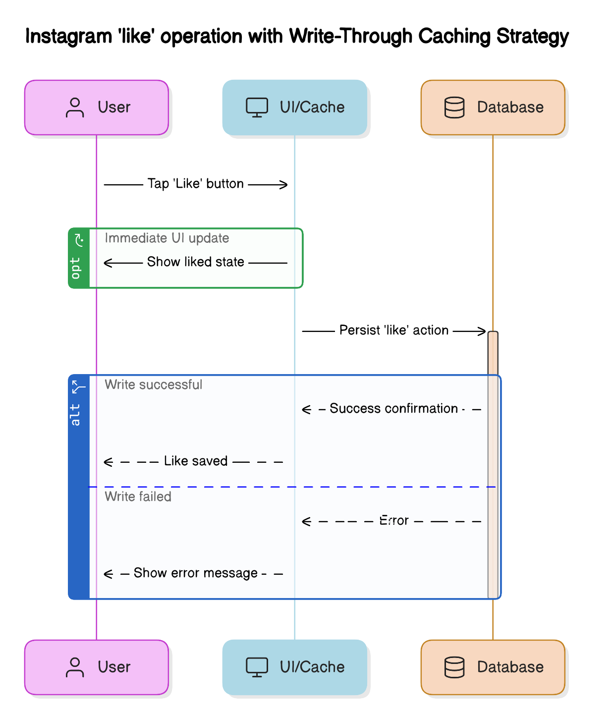 - Example: Let’s think of the “likes” in an Instagram post. When you like a post on Instagram, the application immediately updates the UI to show your like. At the same time, it updates a backend cache and the permanent database. This ensures you see the change instantly, and the new like count is quickly and reliably reflected for all users.